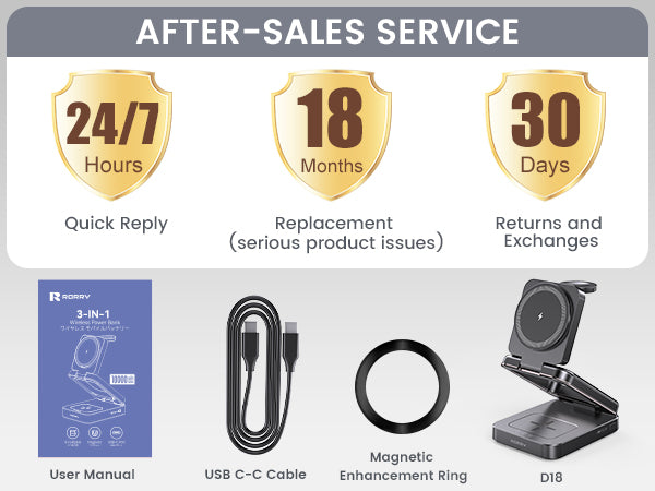 - What’s in the Box – Includes RORRY 3-in-1 portable charger, USB-C cable, magnetic ring, manual, and 12-month warranty. (Adapter not included.)