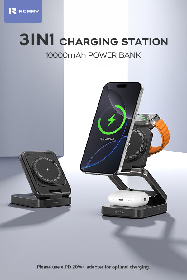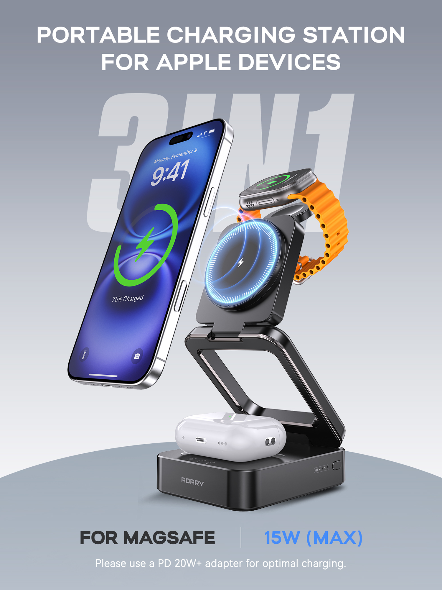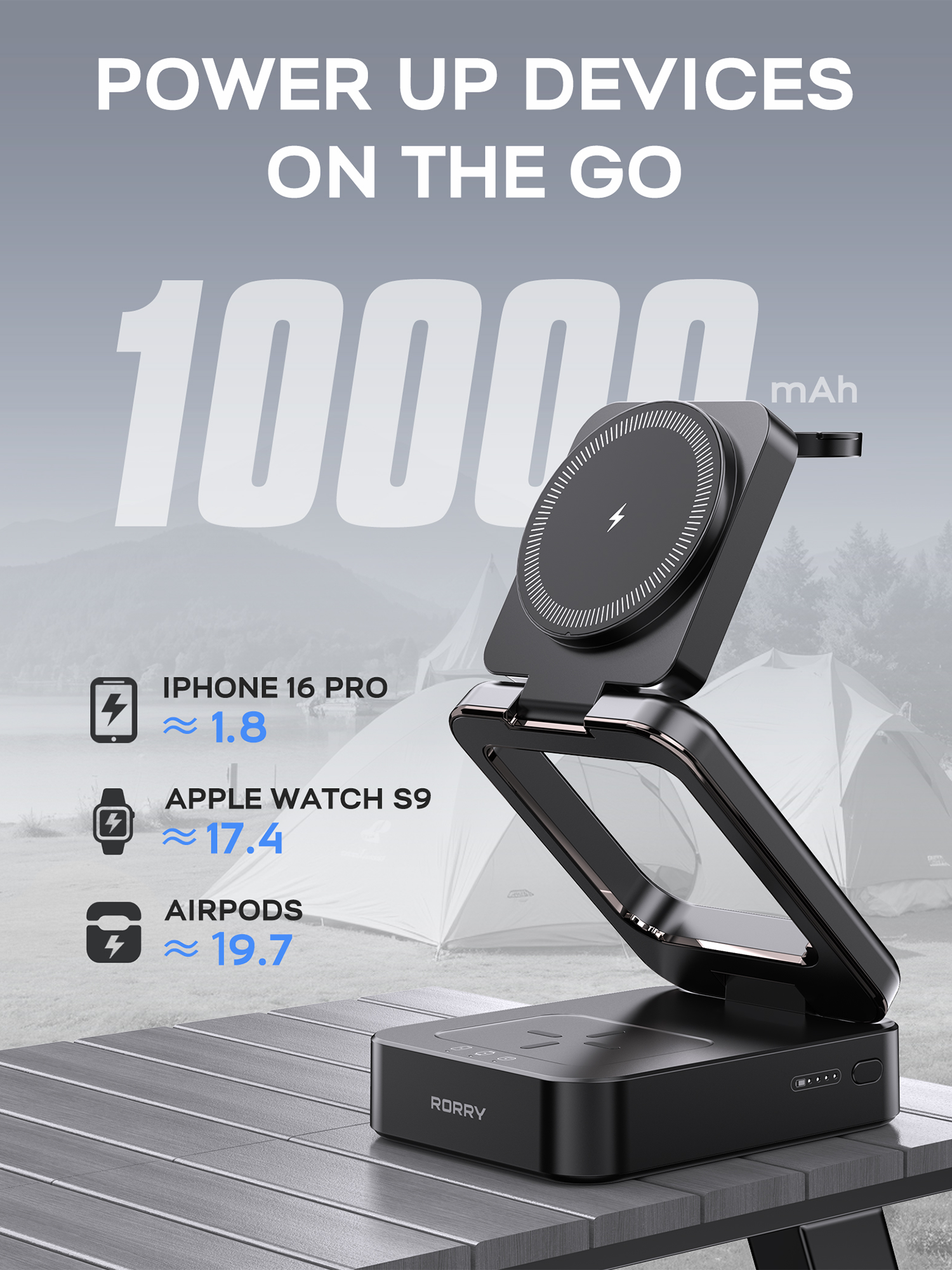 RORRY D18 10000mAh 3-in-1 Portable Charger with Power Bank, Foldable Wireless Charging Station for iPhone 16/15/14/13/12, Apple Watch & AirPods, MagSafe Compatible