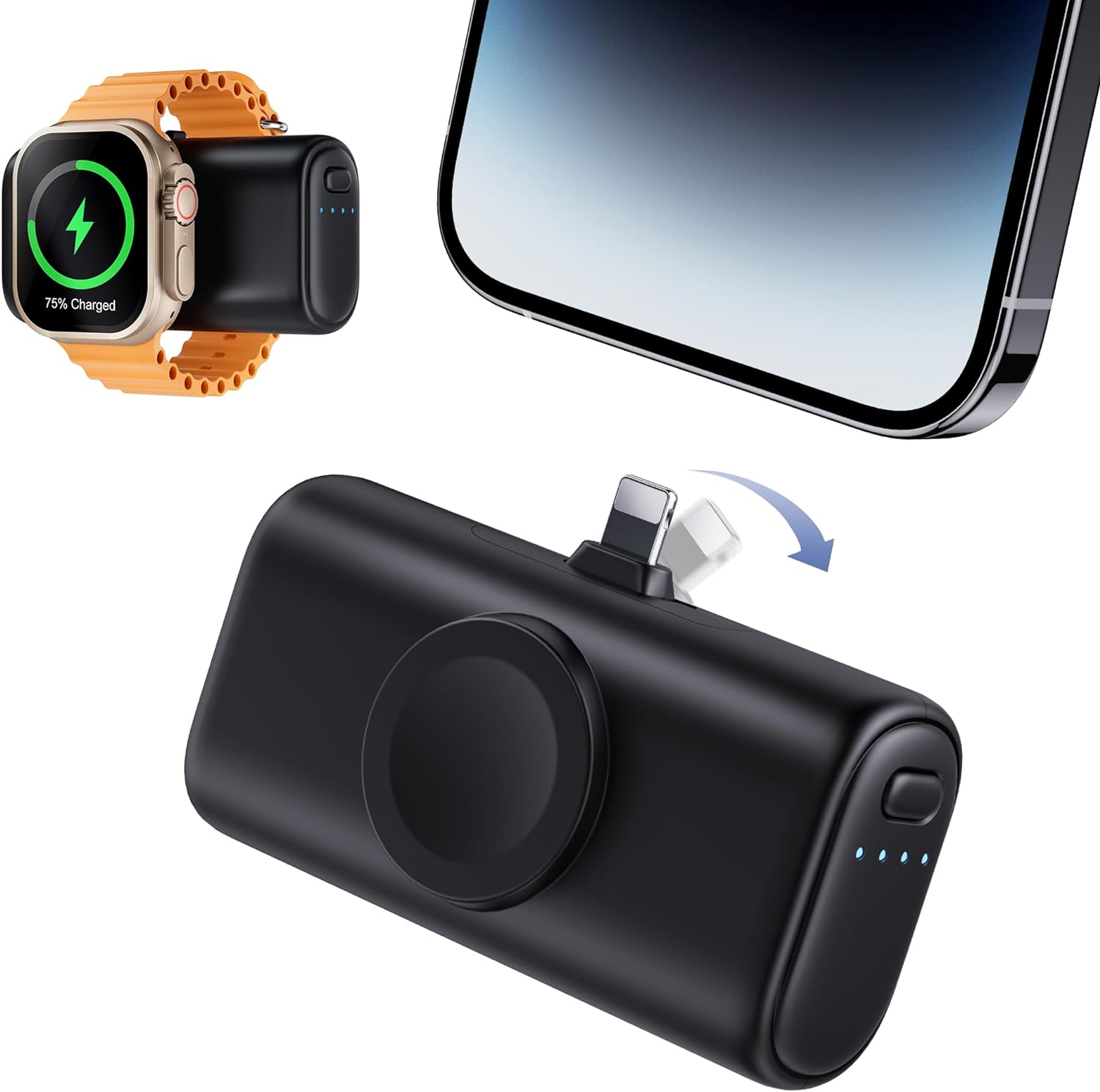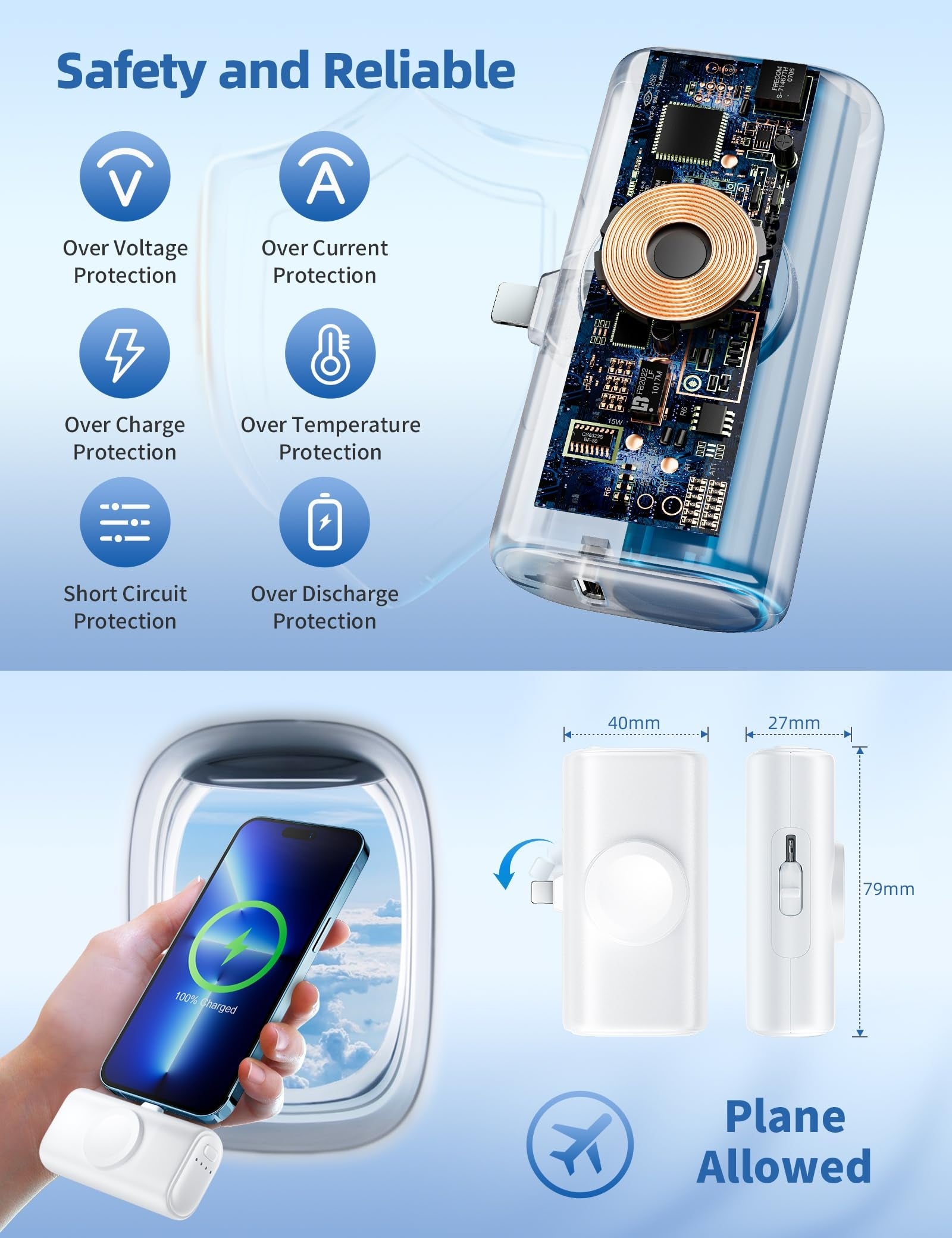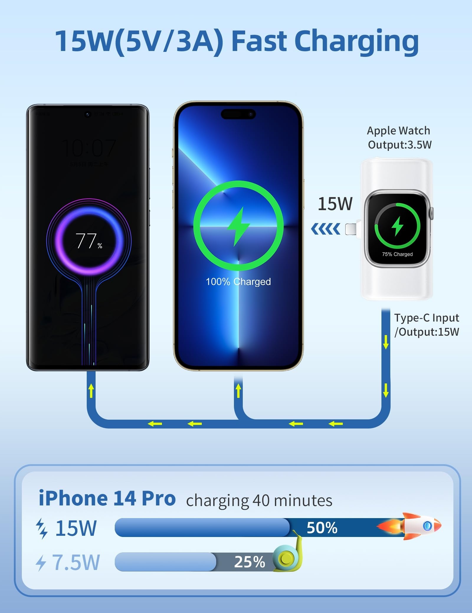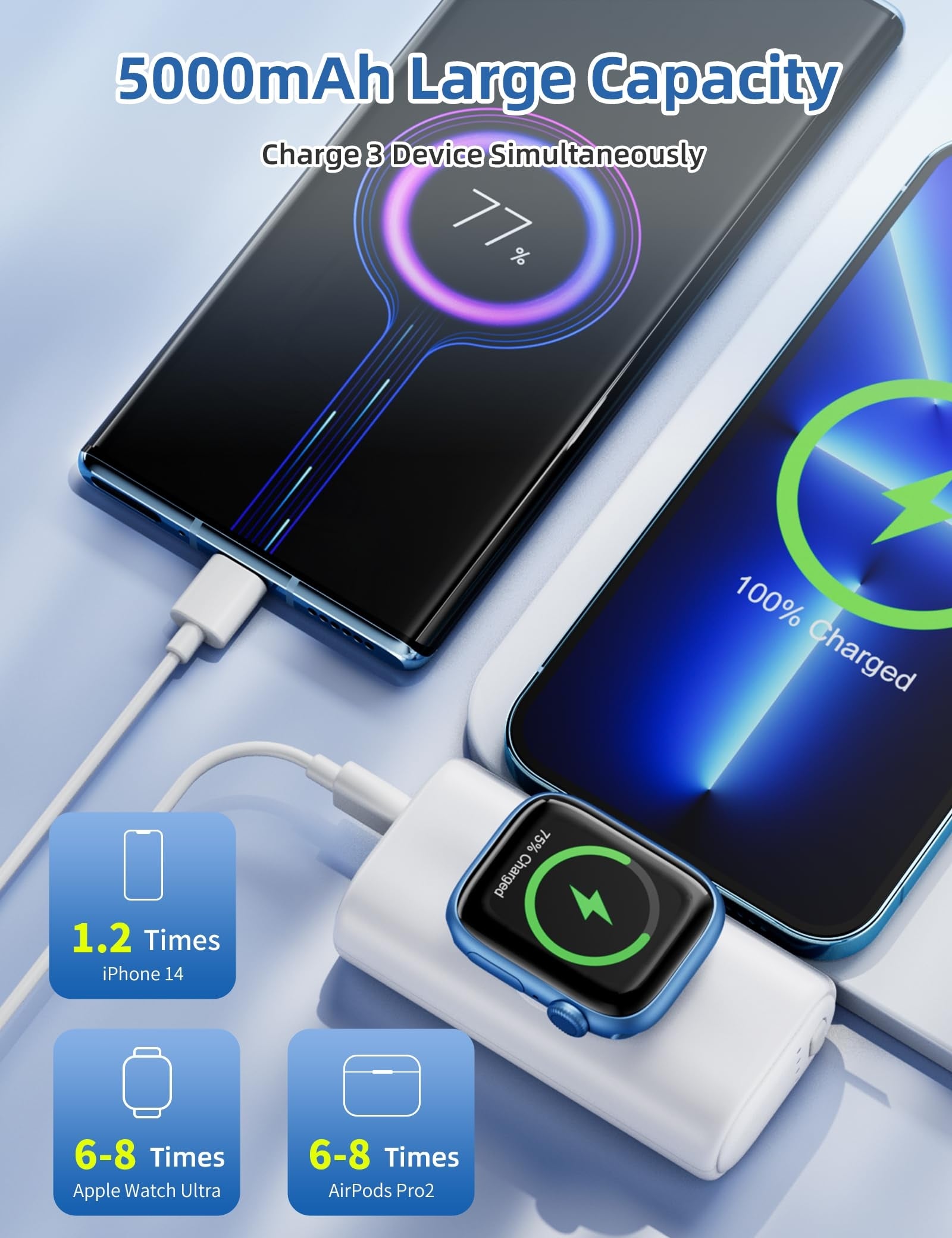 - 【True 5000mAh large capacity】This is a true 5000mAh (3.7V/18.5Wh) capacity mobile power that is the best emergency portable charger for iPhone, Apple Watch, AirPods. It can charge iPhone 14 about 1 time, iWatch 9 about 7 times and Airpods about 7 times.