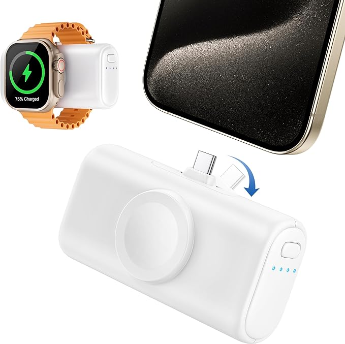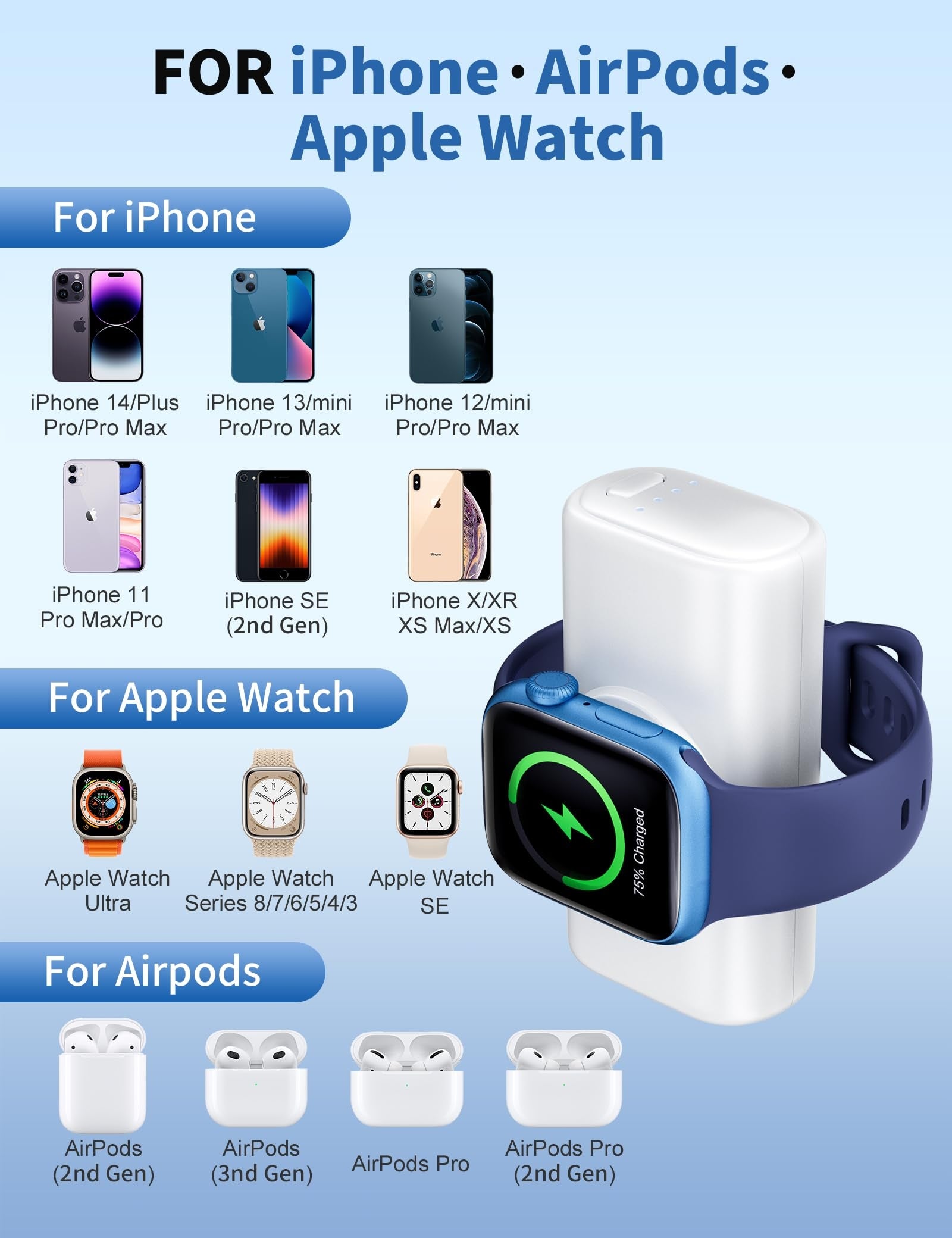 The 3 in 1 portable charger power bank is specially designed for iPhone 14/13/12/11/XR/X/8/7/6/Pro/Max, Airpods, Apple Watch Series 9/Ultra2/8/Ultra/7/6/5/4/3/SE. the USB-C output / input port can also charge your all type-C charging device (Compatible with Samsung/LG/OnePlus/Google/Huawei etc).