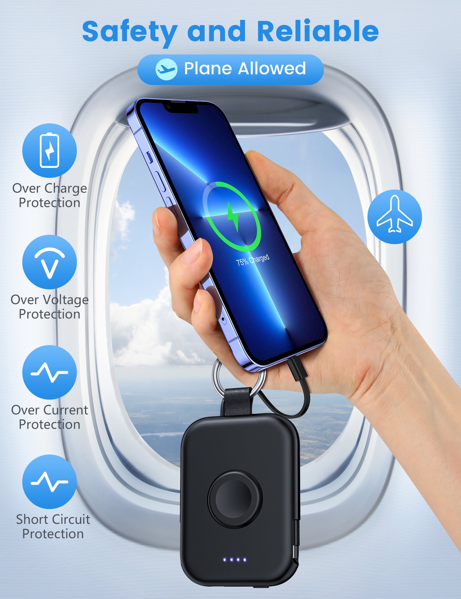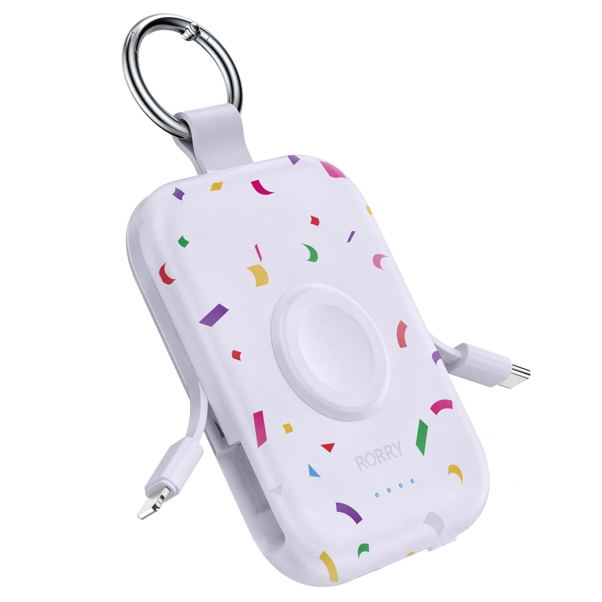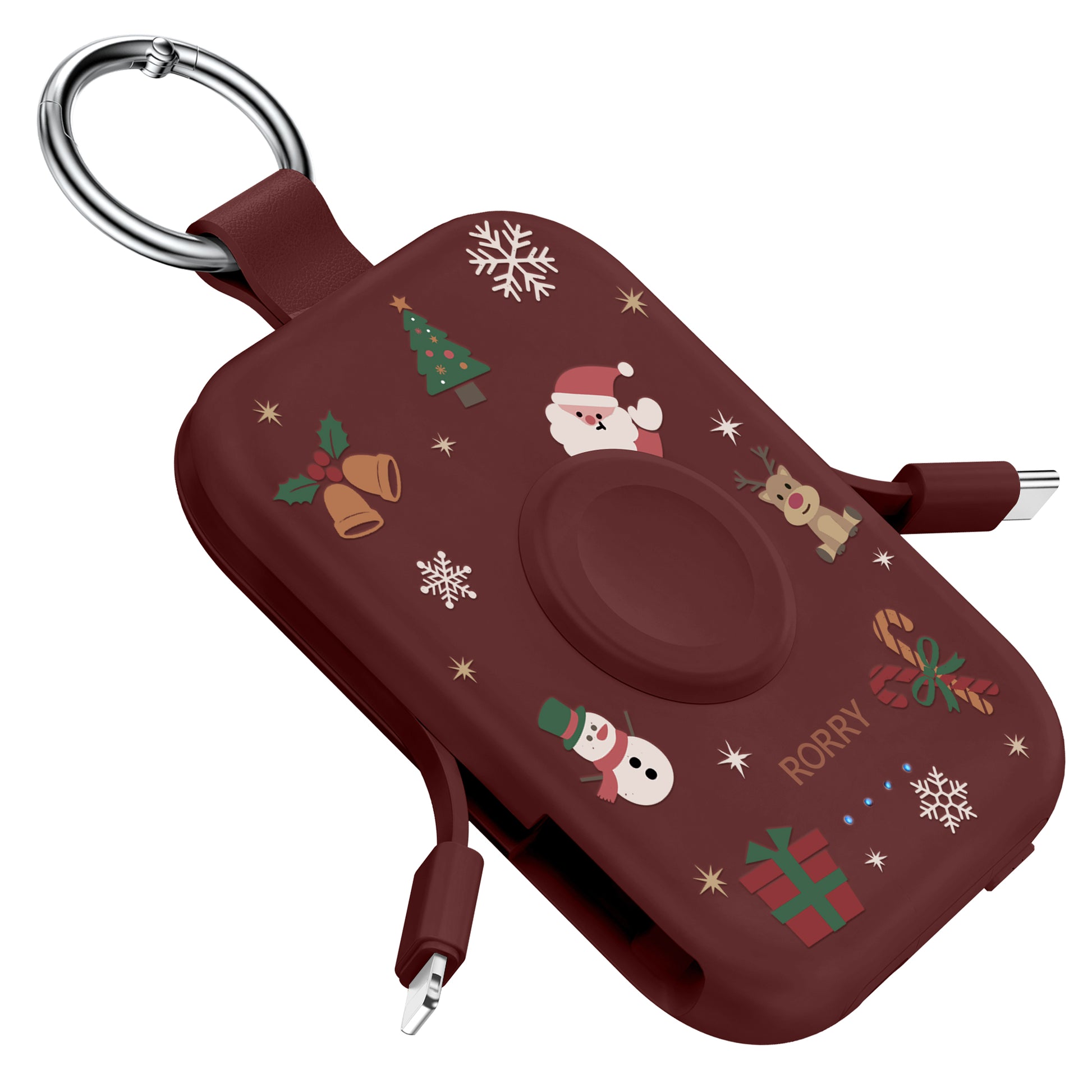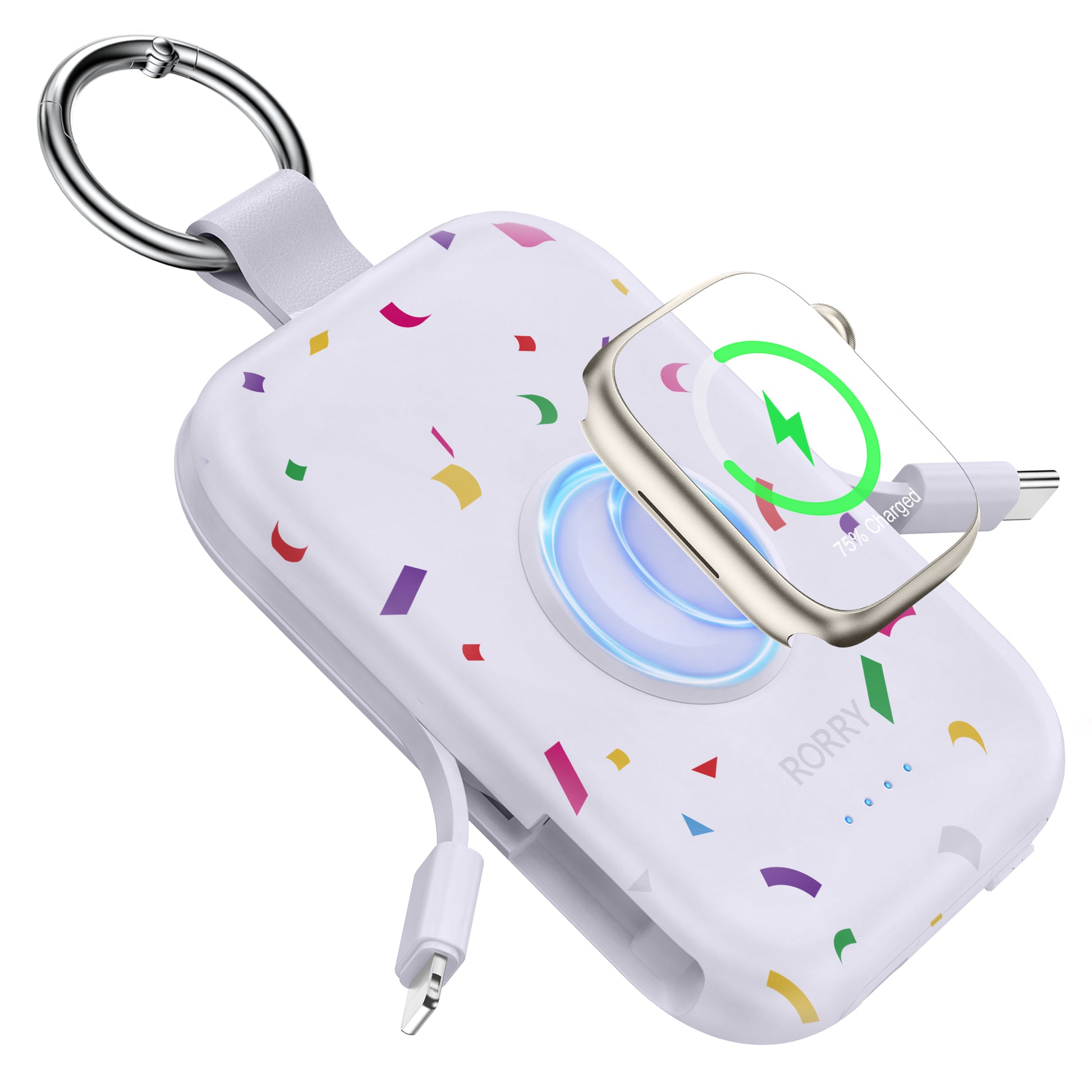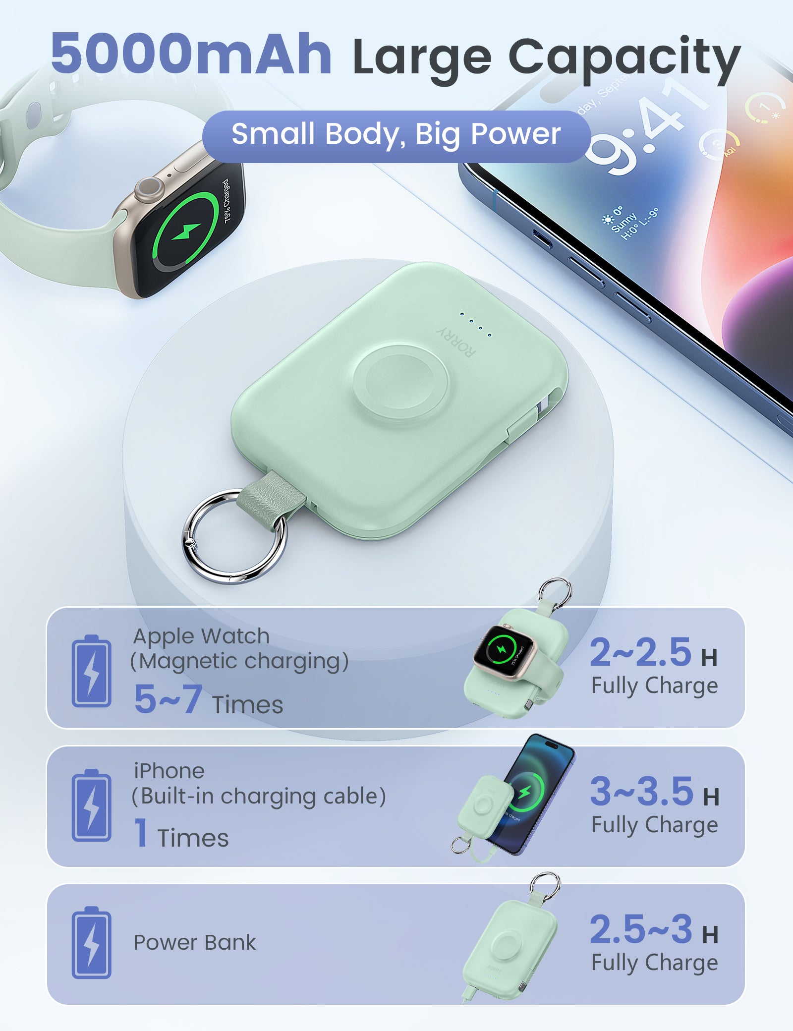 RORRY D2 5000mAh Portable Charger, Portable Charger Power Bank with Built-in Cables, Travel Keychain Battery Pack for Apple Watch Ultra 2/10/9/8/Ultra/7/6/SE/5, iPhone 16/15/14/13/12