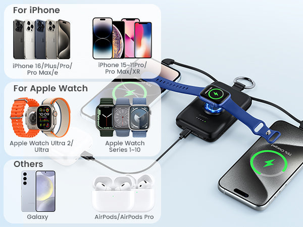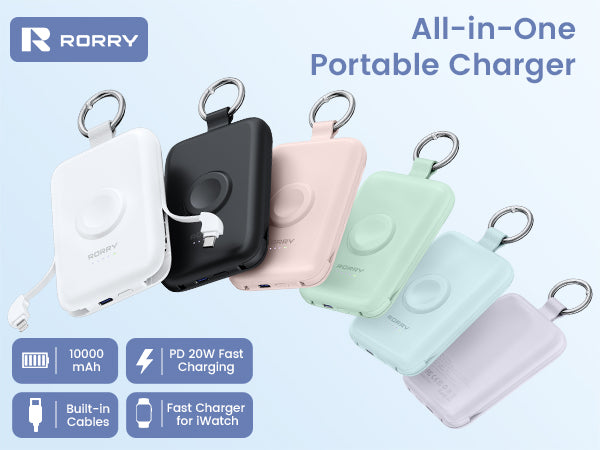 - Meets all Your Charging Needs: RORRY portable charger with built in USB-C cable, iOS cable and magnetic wireless charger for iWatch , widely compatible with iPhone 16/15/14/13/12/11/XS/XR/SE Pro/Pro Max, Apple Watch Ultra 2/Ultra/9/8/7/6/SE/5/4/3/2, AirPods and more.