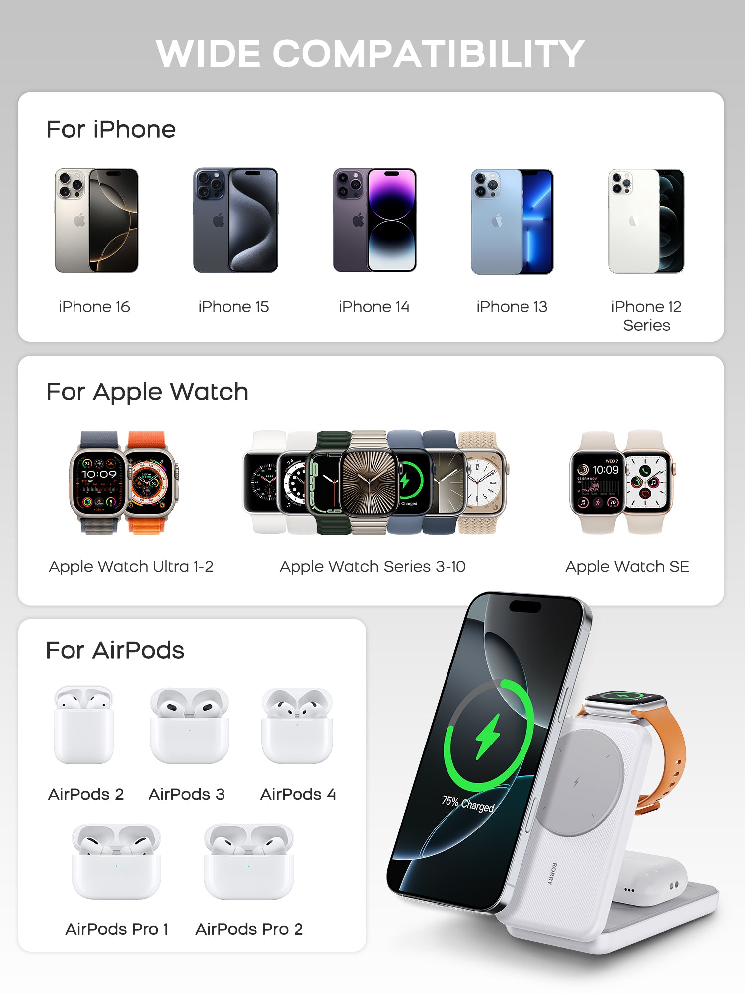 - 3-in-1 Charging Station for Apple Family: RORRY portable charger station combines a 10,000mAh power bank and a 3 in 1 charging station, which is compact and travel-friendly. The magnetic wireless portable charger is compatible with iPhone 16/15/14/13/12 Plus/Pro/Pro Max, for Apple Watch Ultra 2/Ultra/Series 10/9/8/7/6/5/4, for AirPods 4/3/2/Pro/Pro 2, and more.